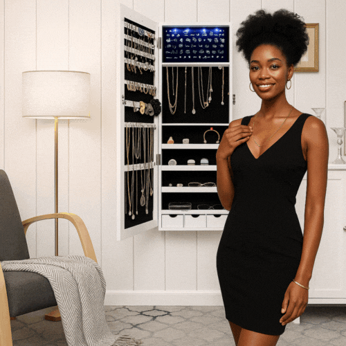 ✨ Un miroir plein pied + un rangement bijoux discret = la touche classe et pratique qu’il vous manquait !